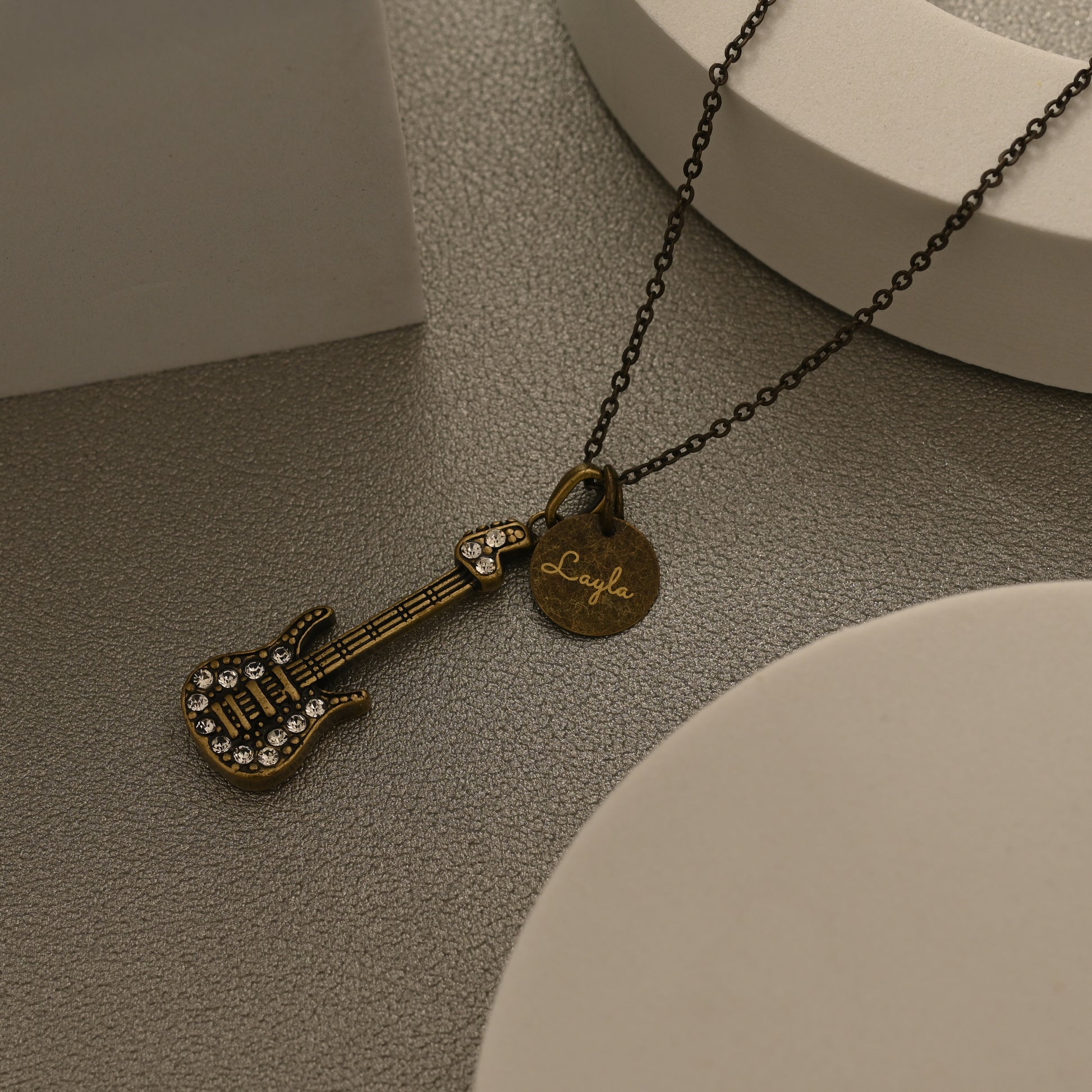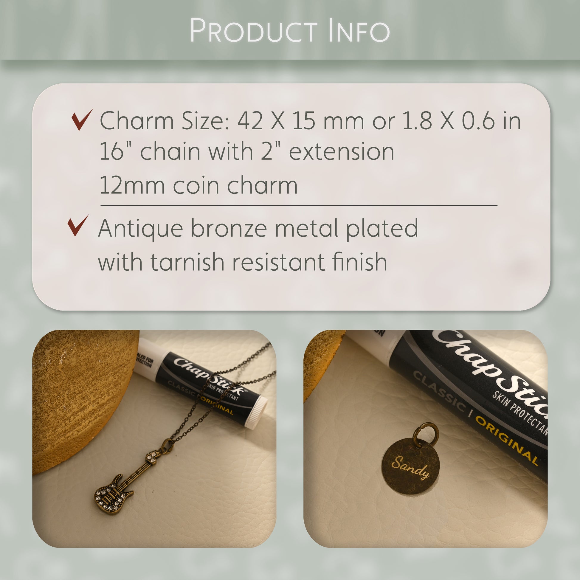Design: Miniature style instrument charn with unique and stylish style with classical antique bronze finish Quality:Antique bronze plated finish with swarovski grade crystlas embelled; crafted in Korea Size: 3.5 cm tall charm, 1.5 cm diameter coin with 16"" ball chain with 2"" extension Use: Gift Idea: thoughtful pick for music lovers and musicians, birthdays, or a small pick-me-up Gift: Ready to Gift: boxed for easy giving; optional engraving on add-on coin