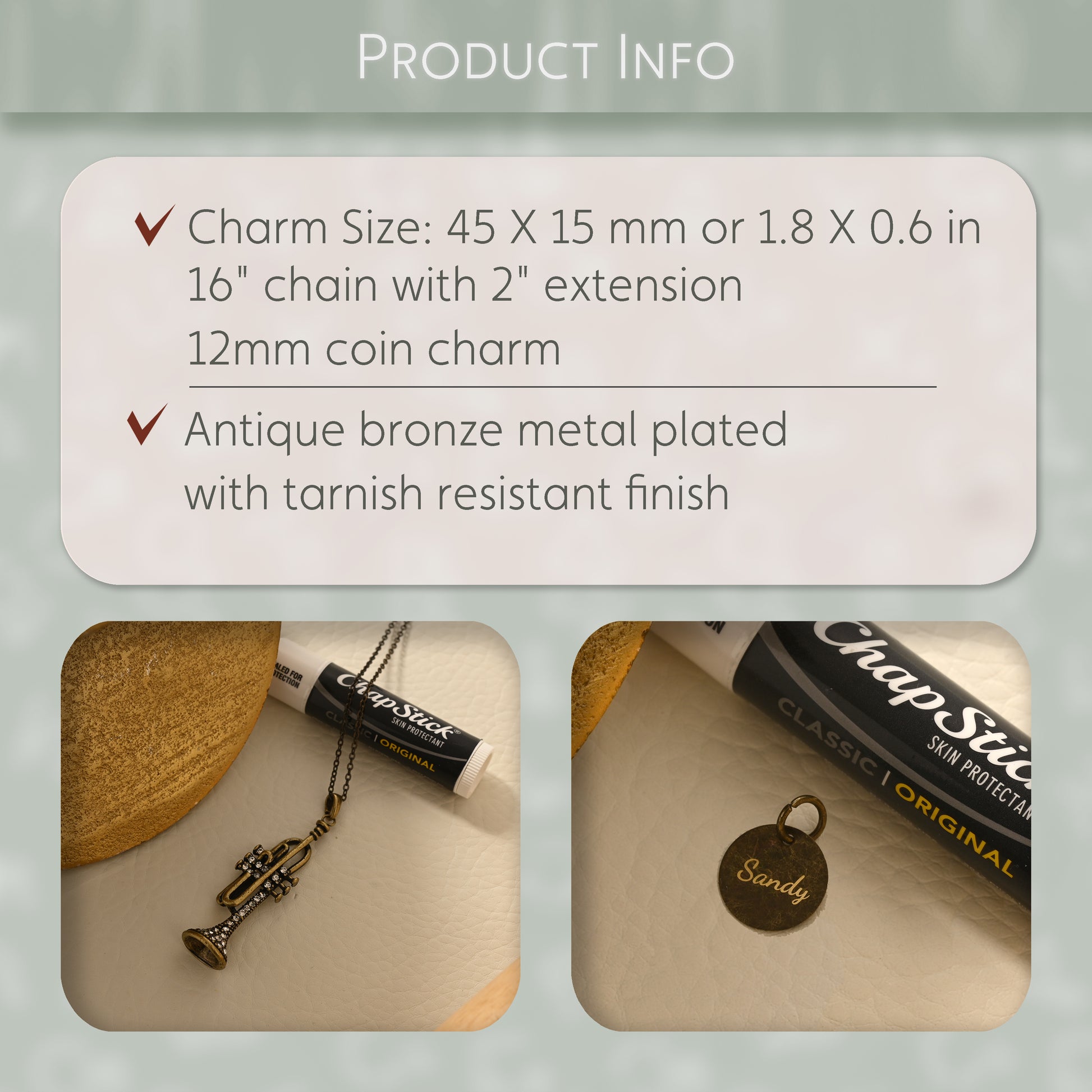 This antique bronze trumpet necklace features a miniature instrument pendant accented with rhinestones and an optional engraved coin charm. Carefully crafted with a detailed finish and durable plating, it makes a meaningful gift for musicians, marching band members, or anyone who loves music. The necklace arrives boxed, ready for gifting.