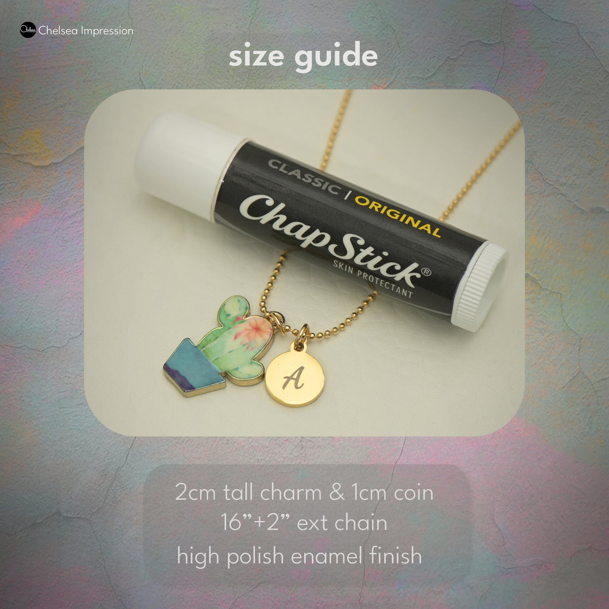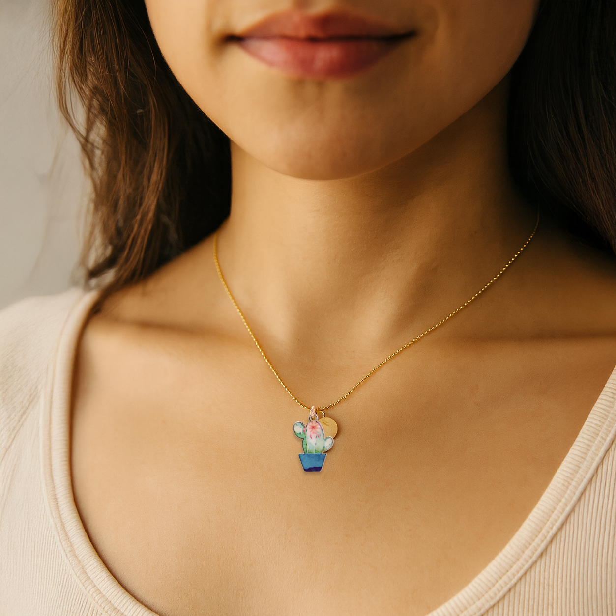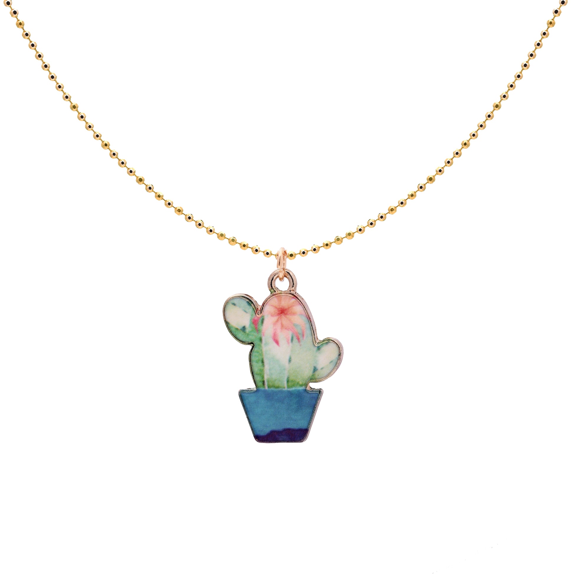 Design: cheerful cactus in a tiny pot with a playful, everyday vibe Quality: gold plated finish with color enamel; crafted in Korea Size: 2cm tall charm 1cm diameter coin with 16"" ball chain with 2"" extension Use: Gift Idea: thoughtful pick for plant lovers, birthdays, or a small pick-me-up Gift: Ready to Gift: boxed for easy giving; optional engraving on add-on coin"